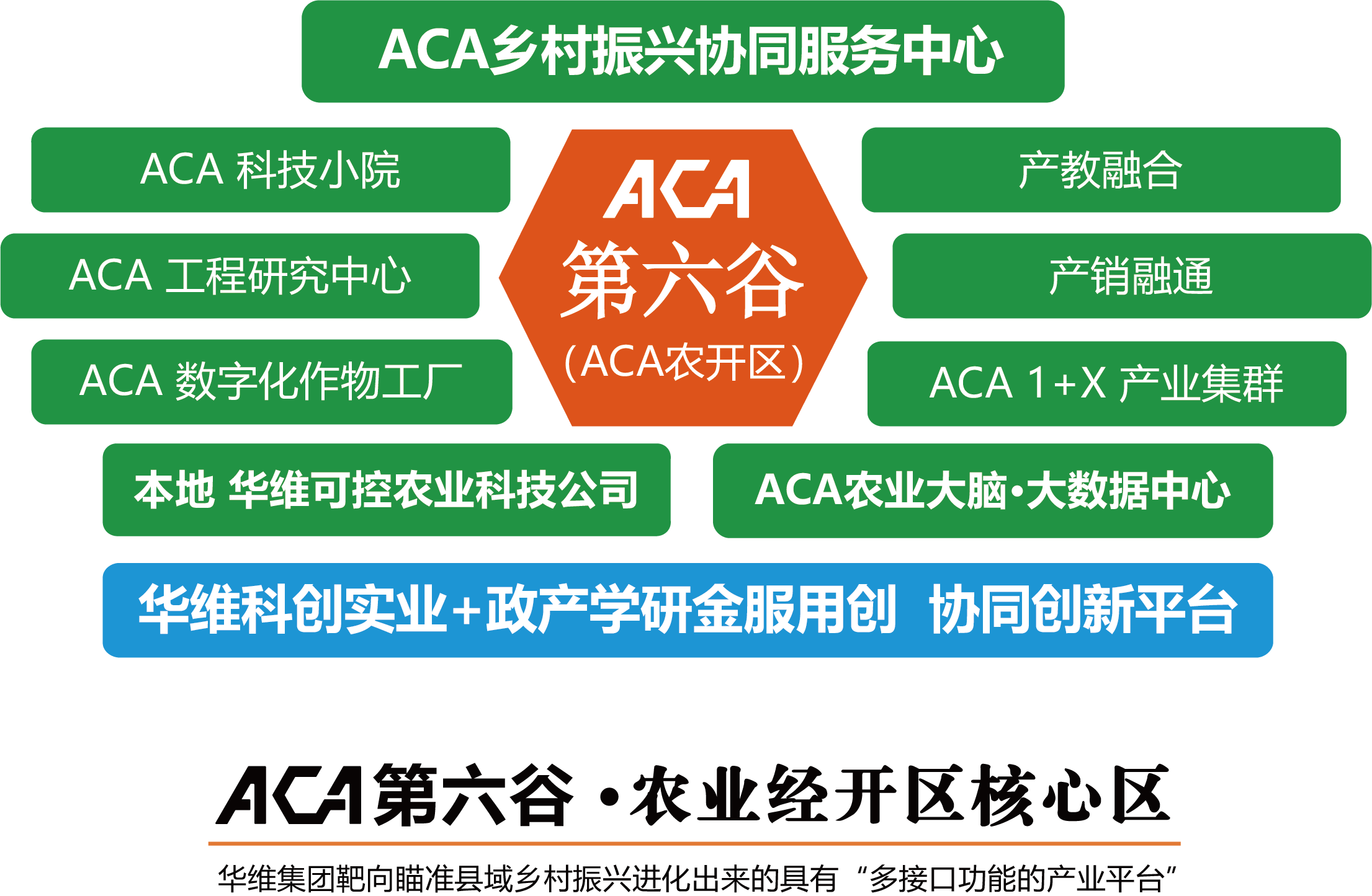 ACA第六谷為ACA農(nóng)開區(qū)核心區(qū),是華維集團靶向瞄準(zhǔn)縣域鄉(xiāng)村振興進(jìn)化出來的具有多接口功能和無限延展性的產(chǎn)業(yè)平臺。
