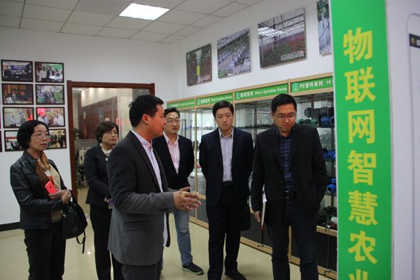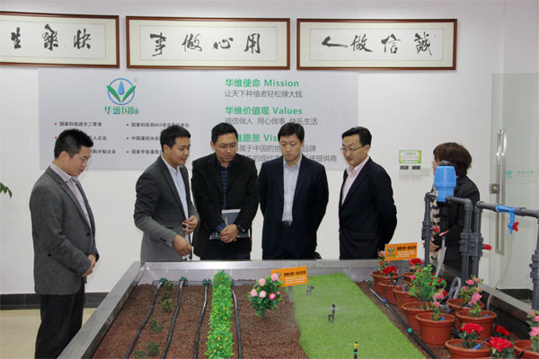 隨后,趙副處長參觀了華維的產品演示中心和研發中心,吳總通過高效水肥一體化智能灌溉系統演示模型的現場工作實景展示,讓大家直觀了解了華維系列產品在實際應用中的效果,并著重介紹了滴灌和微噴在不同應用場合上效果區別以及各自的優勢。