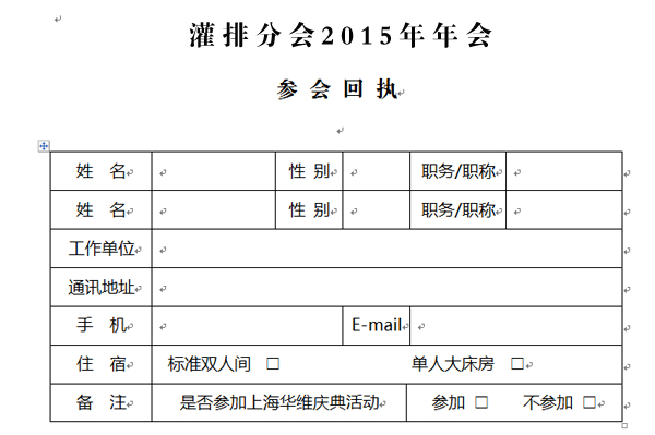 1、請各參會代表將“參會回執表”及“支付憑證”用電子郵件的方式發至灌排分會秘書處,截止時間:2015年12月25日;