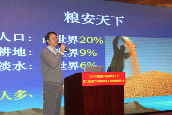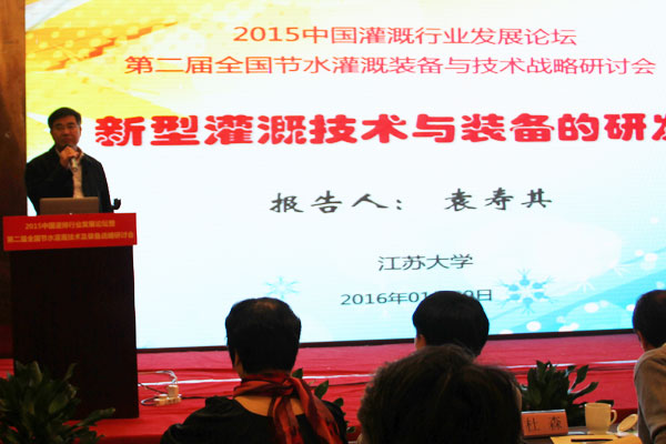 江蘇大學校長袁壽其作了《新型灌溉技術與裝備的研發》的主題報告。袁校長提出高效精準的灌溉裝備是實施節水灌溉的關鍵,江蘇大學開展農業節水裝備共性技術與重大產品的研發,與多家科研院所和企事業單位合作,積極推動行業的科技進步。 江蘇大學校長 袁壽其