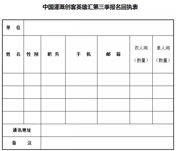 (2) 填寫附件《中國灌溉創客英雄匯第三季報名回執表》,將回執表用電子郵件方式( ir-hero@foxmail.com )發至中國灌溉創客孵化中心教務處。