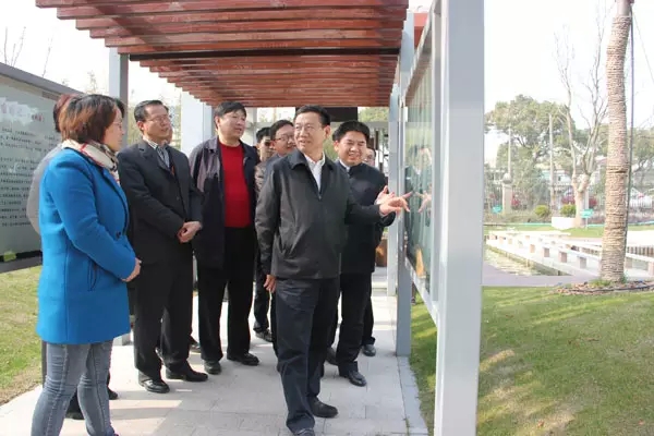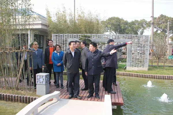 上海金山區(qū)區(qū)長胡衛(wèi)國(左)參觀華維水文化園