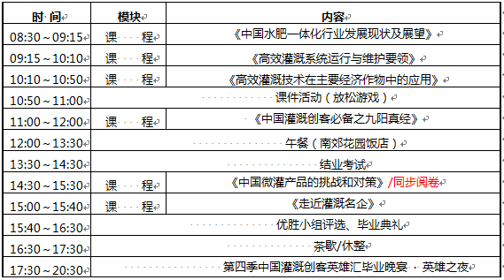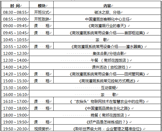 本季培訓班得到了中國灌區協會微灌分會、中國氮肥工業協會水溶肥分會的大力支持。被業界譽為“中國水肥一體化司令”的重量級神秘嘉賓更將親臨授課,蟬聯“中國灌排行業優秀青年企業家”、榮獲“上海市農業領域十大領軍人才”的業界大咖將傾情演繹其十五年風雨陽光創業路,中心課程開發小組精心準備的實操性極強的定制大餐期待創客英雄豪享!