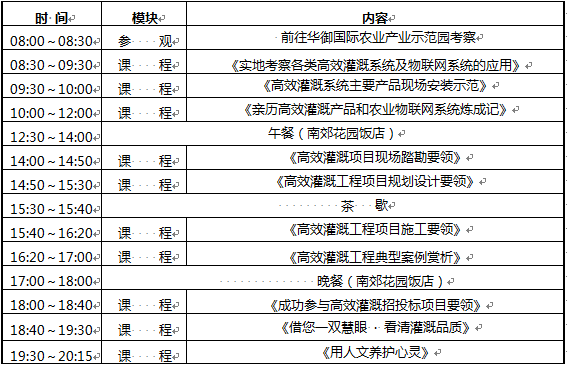 4、面向水利設計院灌溉項目設計師,農業技術推廣人員,溫室公司、農場基地、種子農資等相關企業的灌溉業務主管,大型灌溉項目運維人員等開放部分名額。