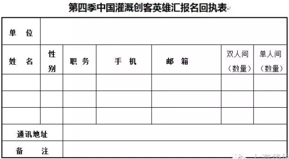 (3) 填寫附件《第四季中國灌溉創客英雄匯報名回執表》,將回執表用電子郵件方式(chuangkepeixun@foxmail.com )發至中國灌溉創客孵化中心教務處。確認回執表→銀行轉賬或微信支付→ 報名成功。