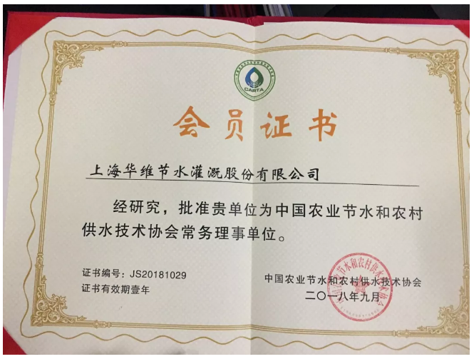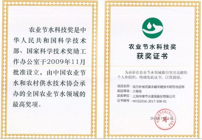 2018年9月18日,中國農業節水和農村供水技術協會第三次會員大會暨農業節水科技獎頒獎大會在北京召開。上海華維榮獲“農業節水科技獎”,這是我國農業節水行業科技發展水平的最高獎項。