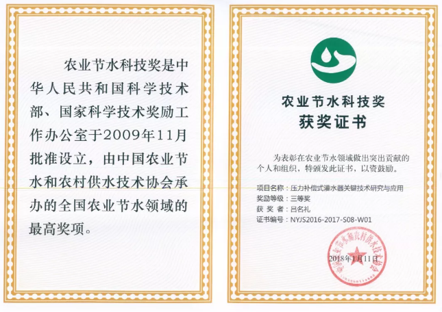 上海華維節水灌溉股份有限公司“壓力補償式灌水器關鍵技術研究與應用”項目斬獲農業節水科技三等獎,項目負責人華維董事長呂名禮高級工程師、科創中心主任張中華工程師,常務副廠長吳小李工程師等人分別榮獲農業節水科技個人三等獎。