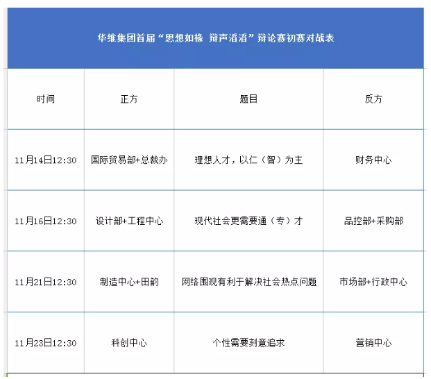 11月13日,由華維黨支部、工會(huì)、行政中心組織開展的首屆“思想如椽 辯聲滔滔”辯論賽正式鳴鑼開賽。