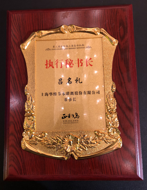 換屆儀式上,華維節水科技集團股份有限公司(原上海華維節水灌溉股份有限公司)董事長呂名禮當選第三屆正和島上海島鄰機構執行秘書長。