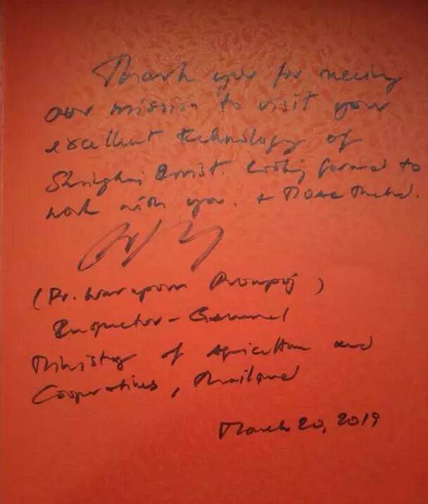 2019年3月20日,泰國農業與合作社部督察長Ms.Waraporn Prompoj、泰國駐上海總領事館農業處代理農業領事(泰國駐華大使館農業處農業公使)Mr.Adisorn Chanprapalert等一行到訪華維集團,就智慧農業裝備相關技術進行實地考察。
