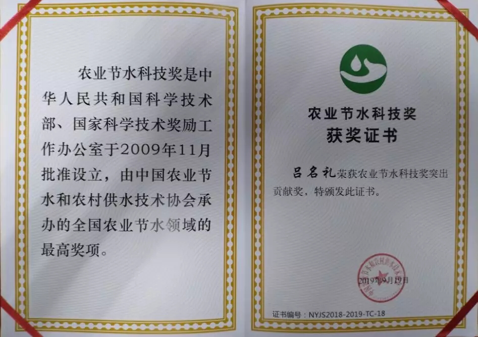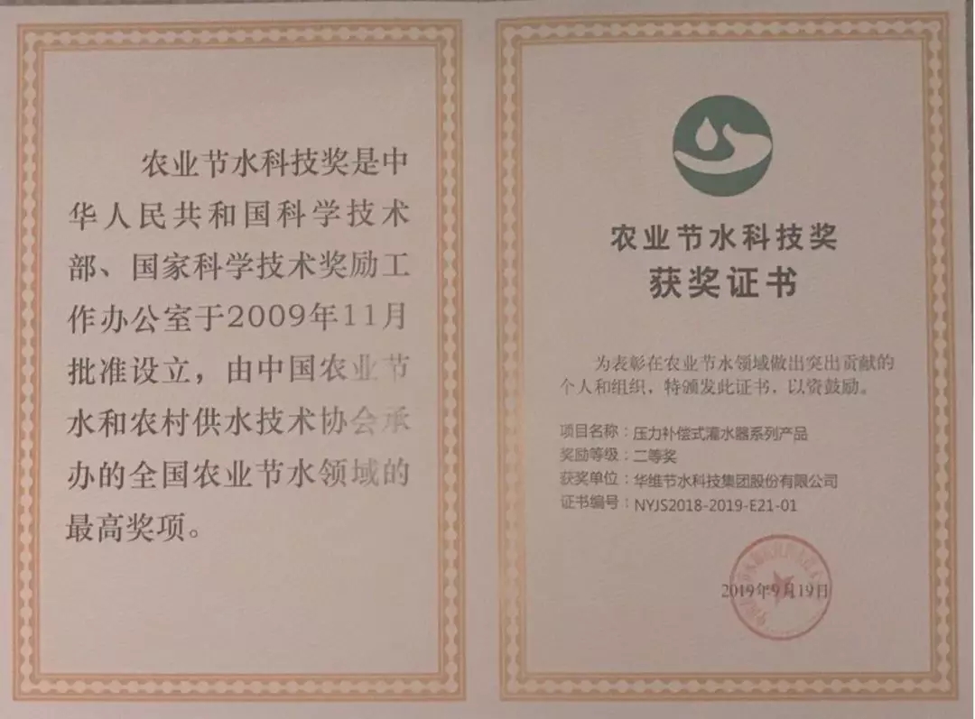 2019年9月21日,由華維集團承辦的全國農業節水和農村供水技術發展高峰論壇在長沙召開,會議開幕式上舉行了農業節水科技獎頒獎大會,華維榮獲農業節水科技獎二等獎、董事長呂名禮榮獲農業節水科技獎突出貢獻獎兩個重磅獎項。(農業節水科技獎是經科技部、國家科學技術獎勵工作辦公室批準,由中國農業節水和農村供水技術協會承辦的全國農業節水領域的最高獎項,是我國農業節水領域的唯一獎項。)
