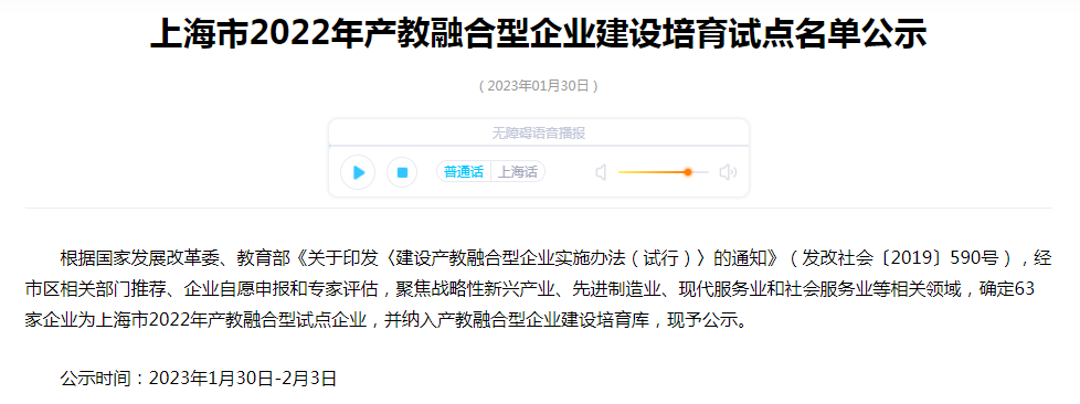 近日,根據(jù)國家發(fā)展改革委、教育部《關(guān)于印發(fā)〈建設(shè)產(chǎn)教融合型企業(yè)實施辦法(試行)〉的通知》(發(fā)改社會〔2019〕590號),經(jīng)市區(qū)相關(guān)部門推薦 、企業(yè)自愿申報和專家評估,聚焦戰(zhàn)略性新興產(chǎn)業(yè)、先進(jìn)制造業(yè)、現(xiàn)代服務(wù)業(yè)和社會服務(wù)業(yè)等相關(guān)領(lǐng)域,確定63家企業(yè)為上海市2022年產(chǎn)教融合型試點企業(yè),并納入產(chǎn)教融合型企業(yè)建設(shè)培育庫。