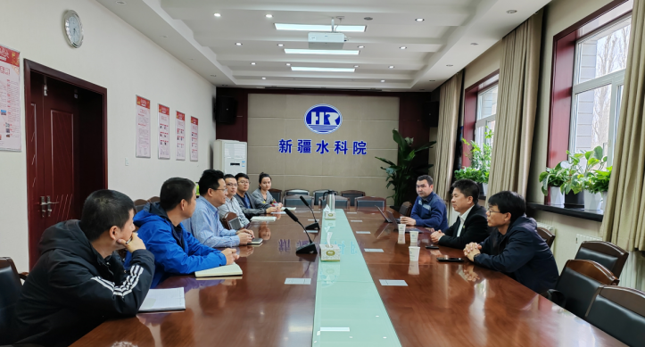 在與新疆水利水電科學研究院(下簡稱研究院)團隊交流中,研究院黨委書記張江輝、副院長聶新山和白云崗、研發中心主任崔春亮等,與華維團隊就科研項目合作、相關水利新產品的研發和成果轉化,及新疆地區水資源高效利用等層面展開深入研討。