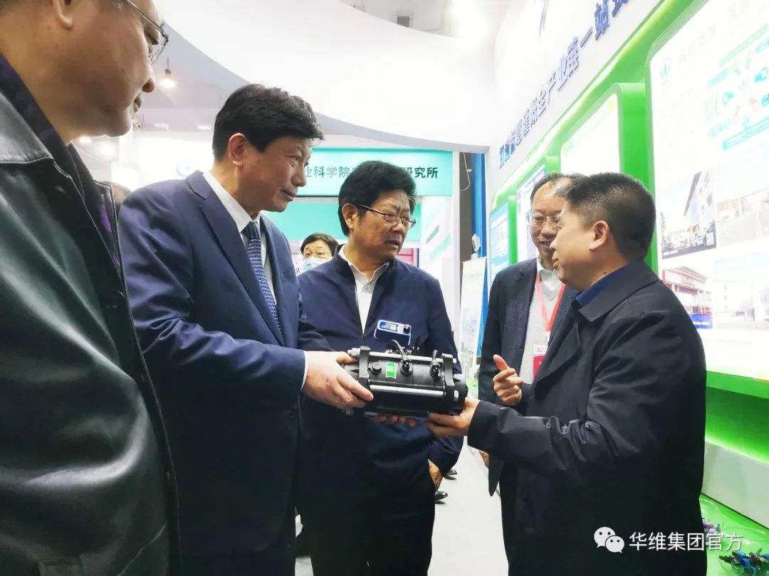 董事長呂名禮(右一)向李衛東(左二)、梅旭榮(左三)等領導介紹華維產品