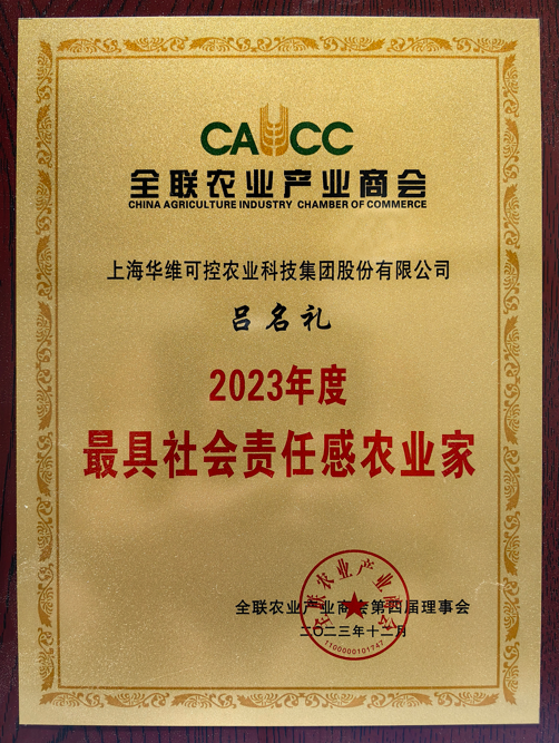 會上,商會對為各自行業、領域做出貢獻的會員企業進行了表彰。華維董事長呂名禮獲評“2023年度最具社會責任感農業家”。