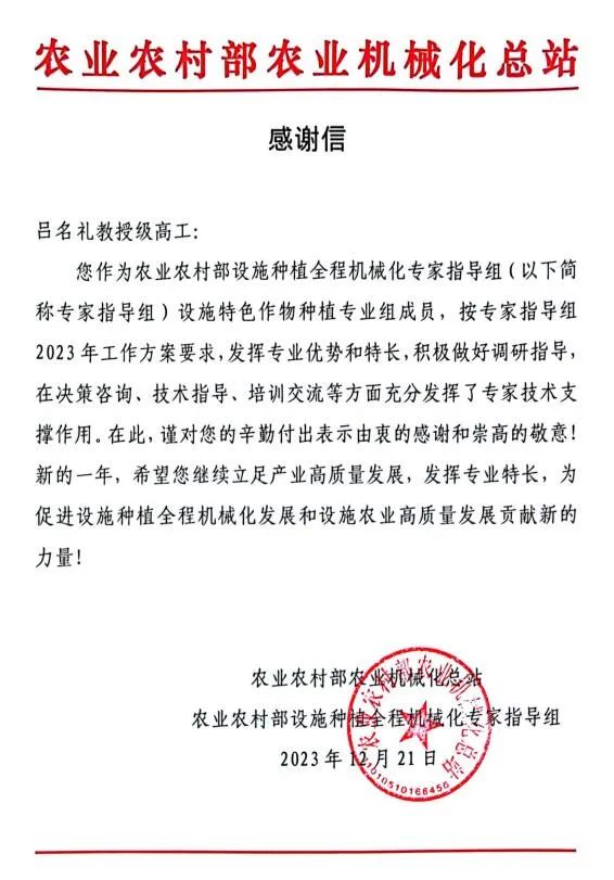 12月21日,農業農村部農業機械化總站發來感謝信,感謝呂名禮在設施特色作物種植專業工作中發揮了專家技術支撐作用。