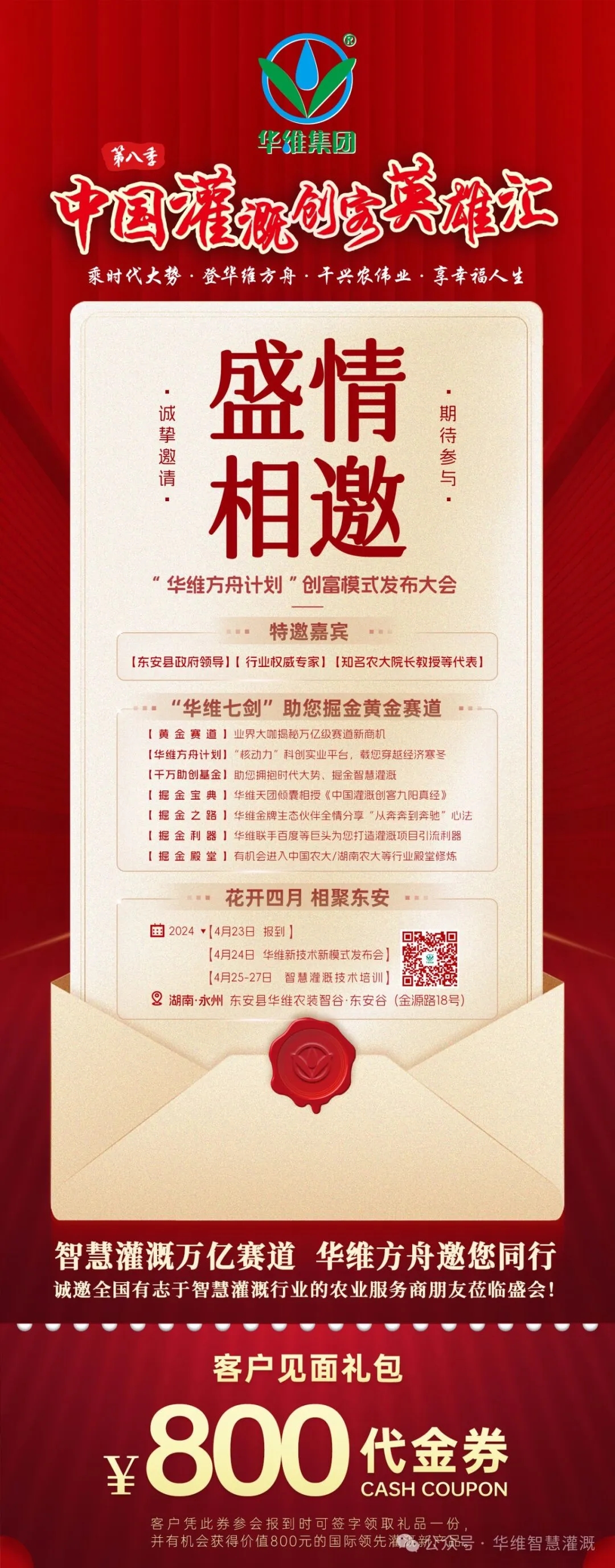 中國灌溉創客英雄匯第八季暨華維“方舟計劃”創富模式發布大會將于2024年4月24日于華維智谷·東安谷(湖南永州-東安)舉行。