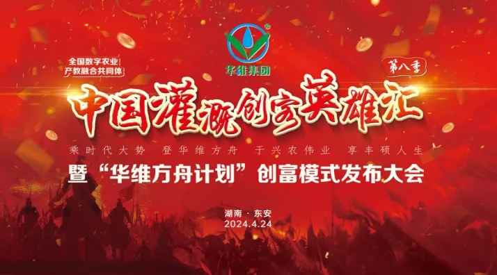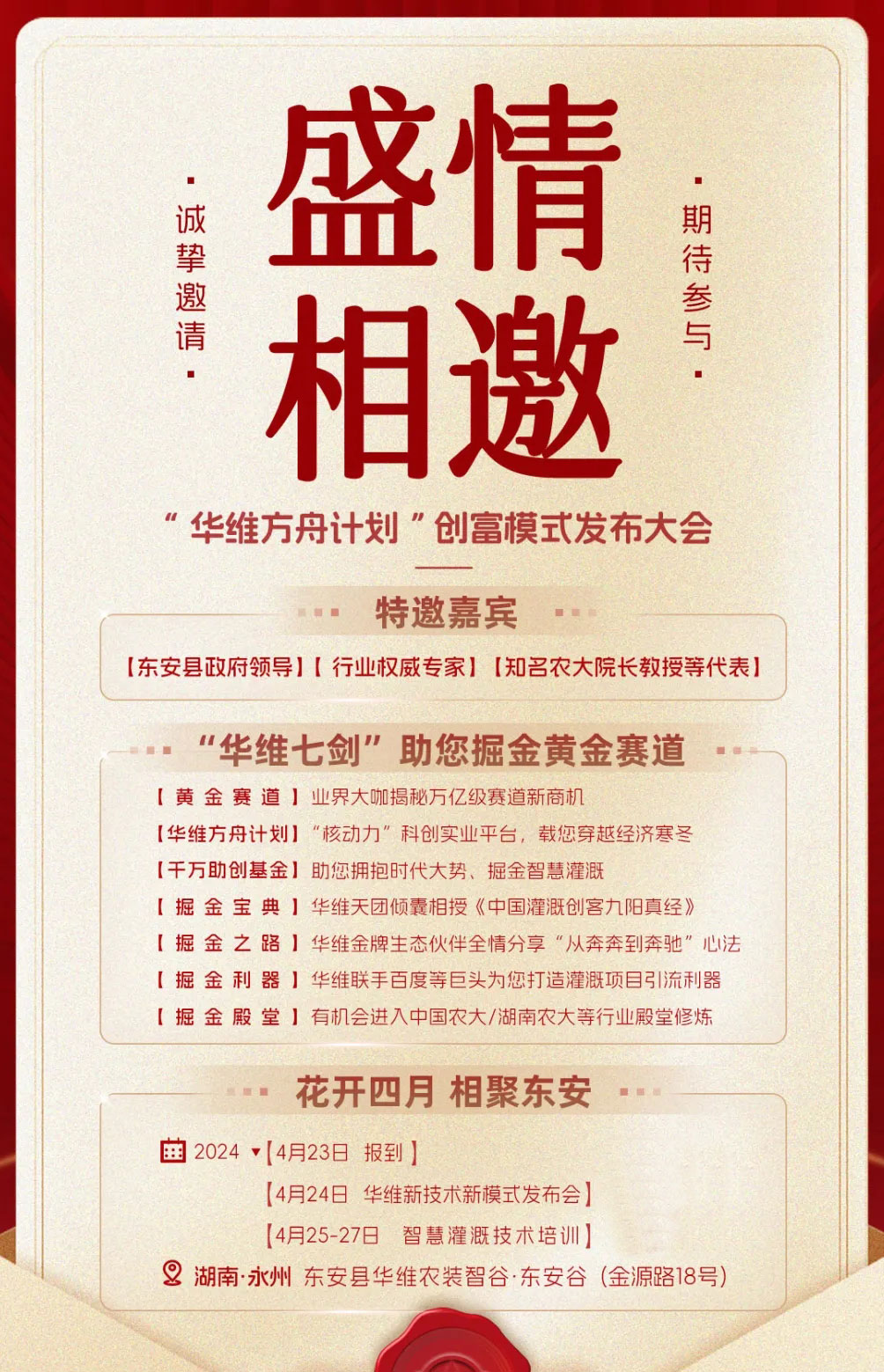 4月24日,灌溉興農 千萬助創(chuàng)——全國數字農業(yè)產教融合共同體·第八季中國灌溉創(chuàng)客英雄匯暨華維“方舟計劃”創(chuàng)富模式發(fā)布大會將在華維農裝智谷·東安谷(湖南東安縣)隆重召開,花開四月,相聚東安!全新灌溉賽道,全新華維模式,我們熱忱歡迎全國客商走進華維,偕手共創(chuàng)智慧灌溉千萬夢想。