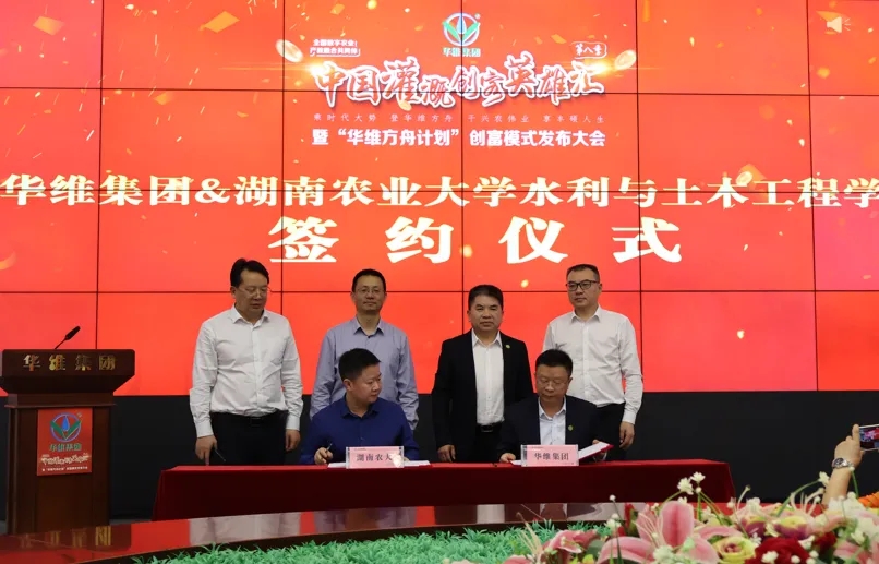 2024年4月24日,在第八季中國灌溉創客英雄匯暨華維“方舟計劃”創富模式發布會上,華維集團與湖南農業大學水利與土木工程學院(下簡稱水院),就聯合創辦“鄉村振興智慧灌溉人才培訓基地”舉行簽約儀式。