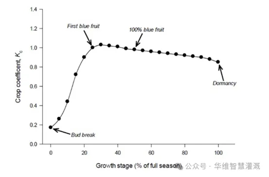 藍莓屬于多年生作物,所以樹齡和修剪方式決定的樹體大小也決定了其需水量,一般較小藍莓植株需水量也較少,1~1.5米左右高度的植株往往用水量高峰也只有3L,新種植的藍莓植株每天用水量約為1~2L,新種植的藍莓由于根系發育不夠健全,往往更容易受到水分脅迫。而目前實際大規模生產中往往采取超額灌溉,灌水量都非常高,同時也造成了大量營養液的浪費。