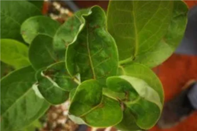 薊馬生命周期短,在理想條件下僅為18-22天,1年可以完成幾代,且花薊馬喜歡聚居在一起。薊馬是基地主要的蟲害對(duì)象,其主要分布在葉表面,但是背部也會(huì)分布,打藥有時(shí)不能打到背部,不能完全控制。其取食葉片導(dǎo)致葉片皺縮(見(jiàn)圖三),對(duì)于葉芽而言,會(huì)導(dǎo)致后長(zhǎng)葉片蜷縮不能完全打開(kāi)。