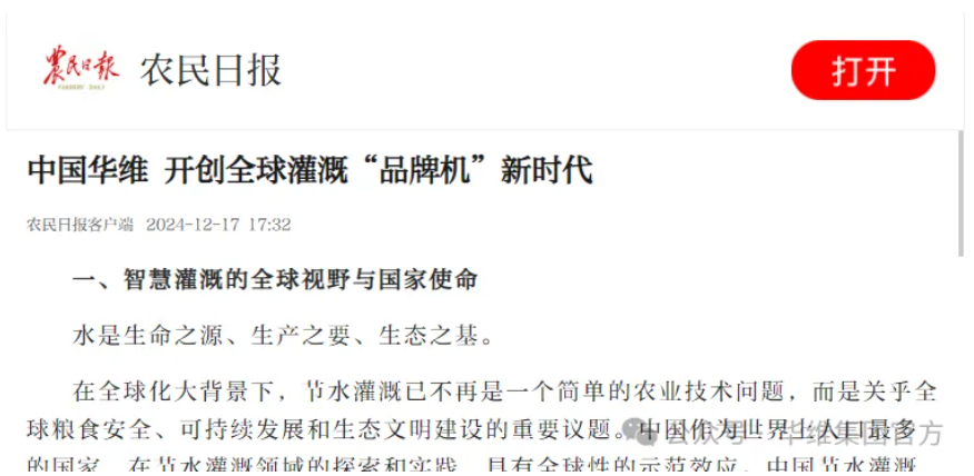 近日,中國三農(nóng)第一報(bào)《農(nóng)民日?qǐng)?bào)》從華維全球“灌溉品牌機(jī)”模式展開分析了智慧灌溉領(lǐng)域的政策支持、市場(chǎng)現(xiàn)狀,及行業(yè)面臨的挑戰(zhàn)。報(bào)道了華維通過科技創(chuàng)新和產(chǎn)業(yè)實(shí)踐,在全球范圍內(nèi)貢獻(xiàn)的中國智慧和中國方案。