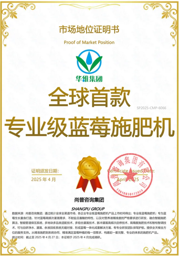 近日,歷時一年升級研發、近一年使用驗證的莓悅專業級藍莓施肥機獲得權威機構(尚普咨詢)“全球首款專業級藍莓施肥機”認證。該證明肯定了莓悅專業級藍莓施肥機的市場規模、產品專業性創新性(詳見后續另文介紹)及品牌影響力等方面的優勢。 目前藍莓種植都是采用通用的施肥機,就像吃大鍋飯,有的吃但不一定吃飽、不一定吃好、不一定夠營養健康,也有可能吃的太撐。這些都不利于藍莓的生長。莓悅專業級藍莓施肥機,是華維集團聯手國內藍莓種植專家,根據藍莓生產的高頻脈沖式灌溉,及不耐鹽、喜酸等生長習性進行技術和功能迭代升級,結合種植生產管理中的實際需求不斷調整優化推出的專為藍莓而生的“水肥智能保姆”,為藍莓種植者提供了一種專業智能的灌溉施肥解決方案。