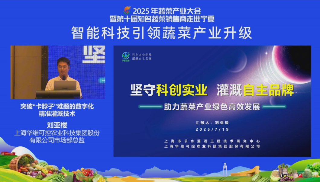 中國工程院院士趙春江、陳劍平、鄒學校,圍繞蔬菜機械化智能化生產、土傳病害治理、產業發展等層面作主旨報告。華維集團受邀參會作主題報告,從二十四年科創實業的積淀,從產品研發、技術創新、解決方案和模式引領等方面分享智慧灌溉和可控農業助力蔬菜產業發展。