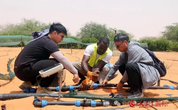 灌溉技術工人穆罕默德·伊塞勒穆蹲在沙地里,熟練地更換著電磁閥智能控制噴淋閥門組件——這是他去年就已經掌握的技能。他說:“中國的同事們來自中國的新疆,當地自然環境和我們這里近似。有中國同事的幫助,我相信這里一定能發展起綠色種植。”