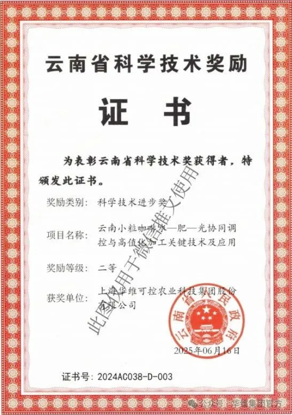 2025年云南省人民政府官網發布《關于2024年度科學技術獎勵的決定》,正式將云南省科學技術進步獎二等獎授予上海華維可控農業科技集團股份有限公司(以下簡稱 “華維集團”)與昆明理工大學、云南農墾咖啡聯合申報的 “云南小粒咖啡水 - 肥 - 光協同調控與高值化加工關鍵技術及應用”項目。