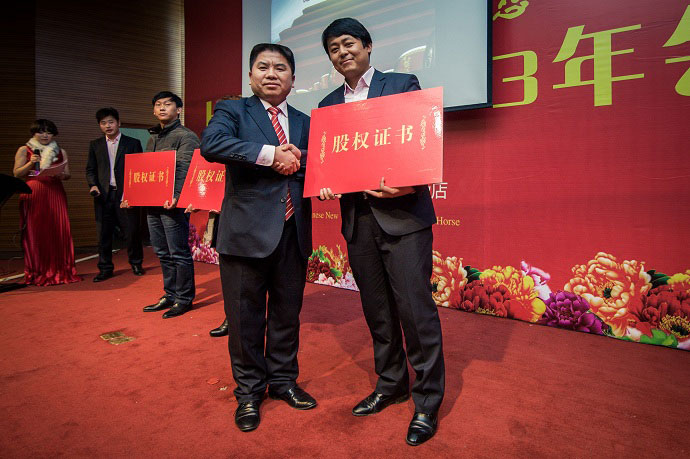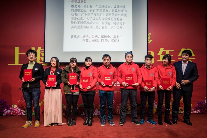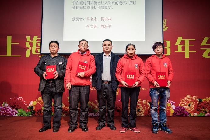 頒獎嘉賓(左一)與員工代表(右一)一起為優秀員工頒獎并留影