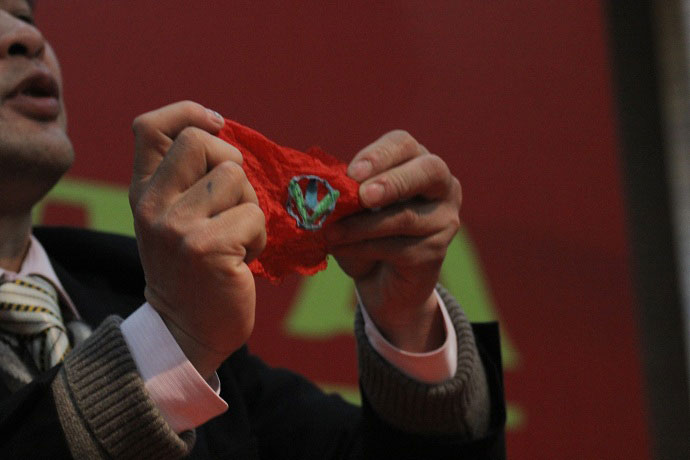 魔術《見證奇跡》,在觀眾的要求下,變出了有華維LOGO的火紅綢緞