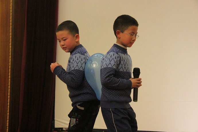 兩位家屬小朋友合唱完畢后,為大家表演兄弟同心,合力破氣球