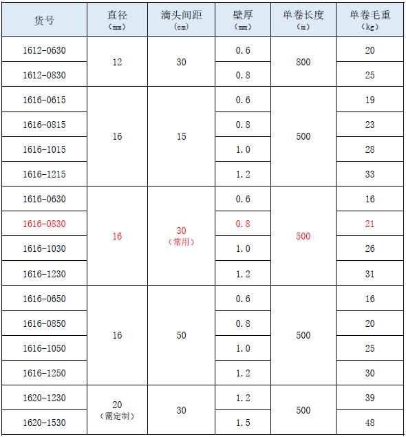 常用滴灌管為Φ16,滴頭流量有2L/h、4L/h;Φ12適合于日光溫室等短行鋪設(shè),經(jīng)濟實用,滴頭流量有1L/h、2L/h;Φ20為華維特色產(chǎn)品,沿程水頭損失小,適用于高速公路綠化灌溉等長距離鋪設(shè)。